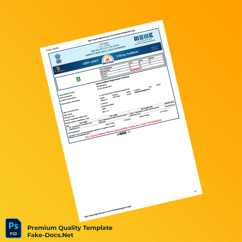 India Ministry of Commerce Udyog Aadhaar Registration Certificate Template (Word & PDF) 4 page