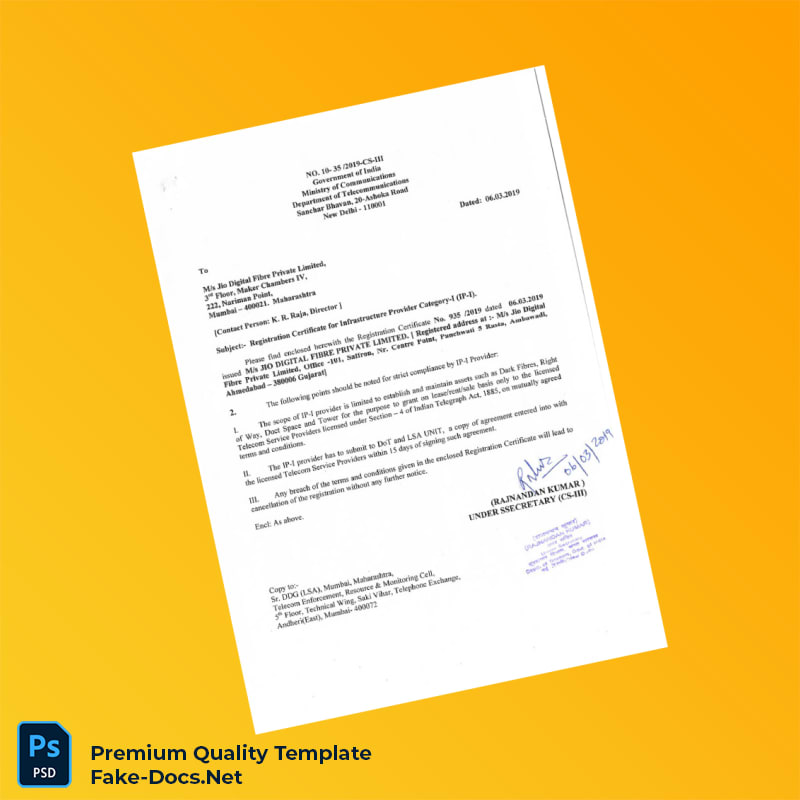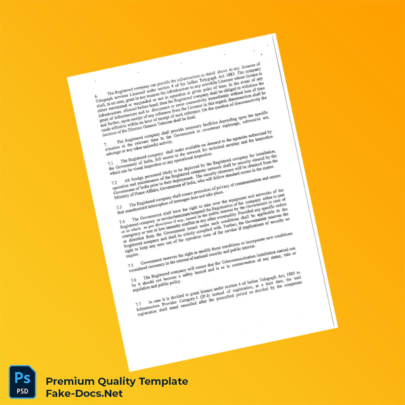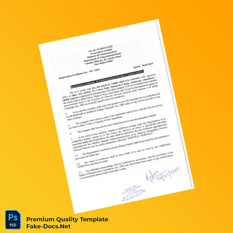 India Ministry of Communications Editable Registration Certificate Template (Word & PDF) 4 page