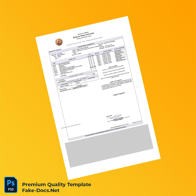 Philippines Bulacan State University Certificate of Registration Template (Word & PDF)