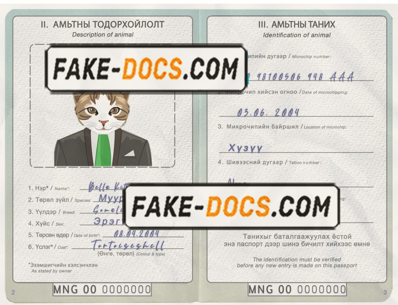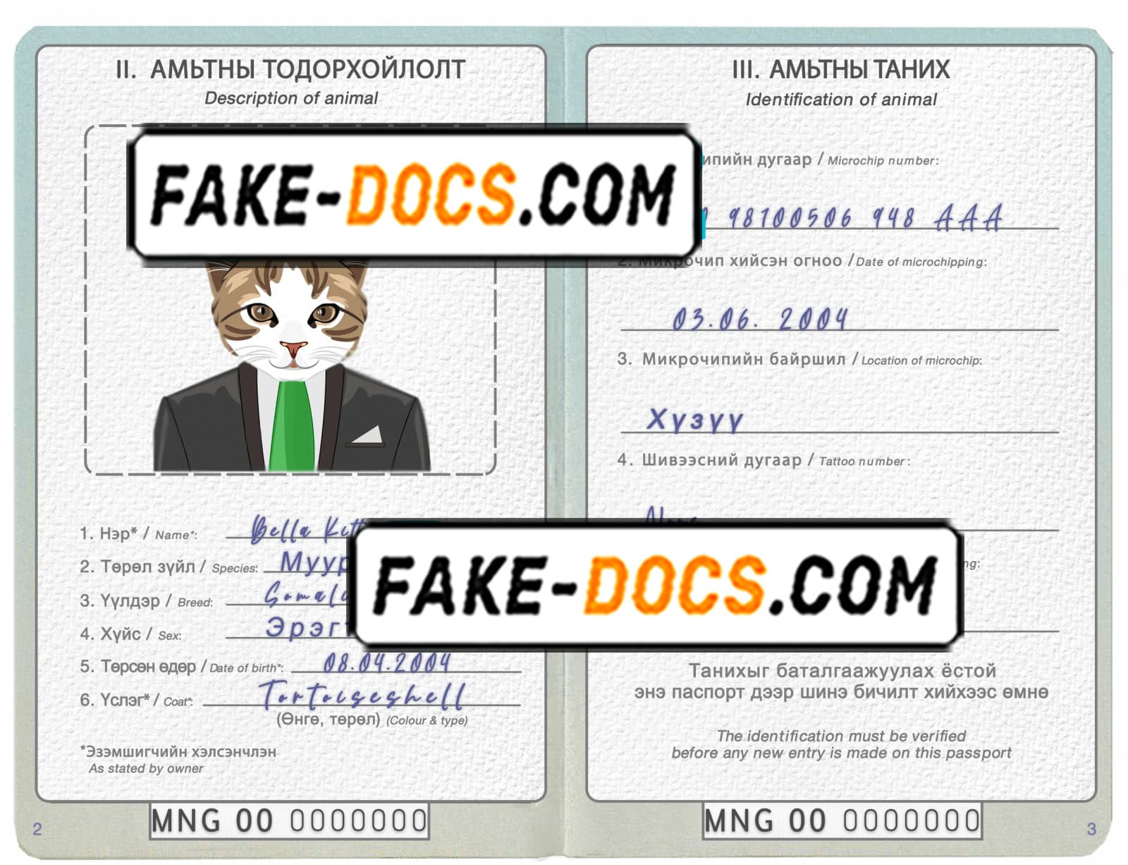 Mongolia cat (animal, pet) passport PSD template, completely editable