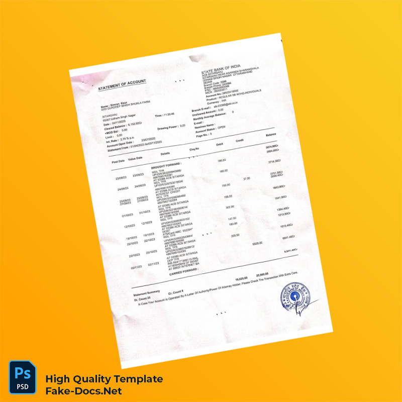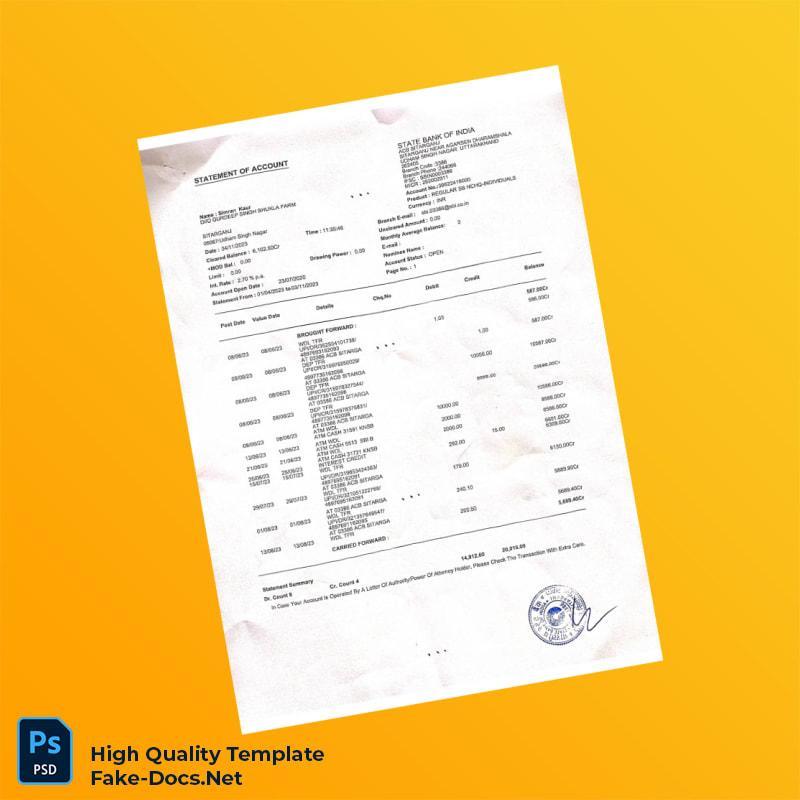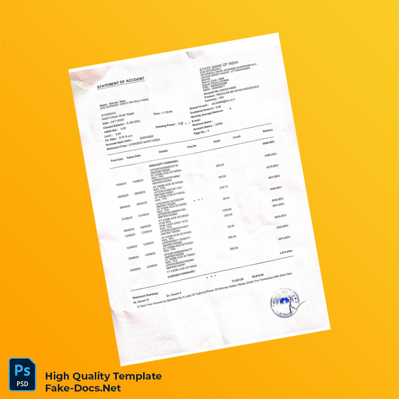 India State Bank of India (SBI) bank statement Word and PDF template, 2 pages