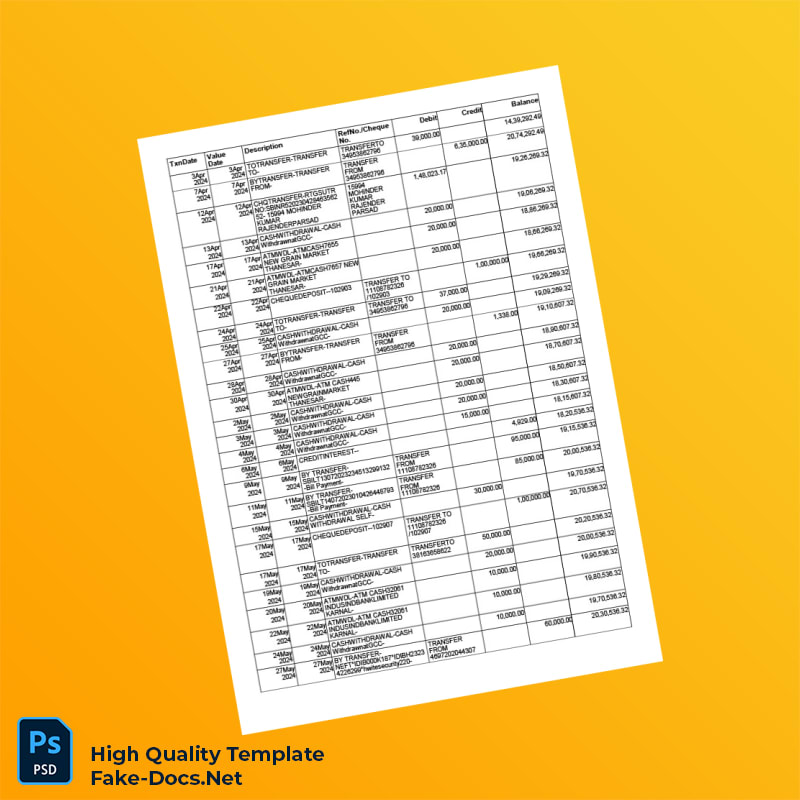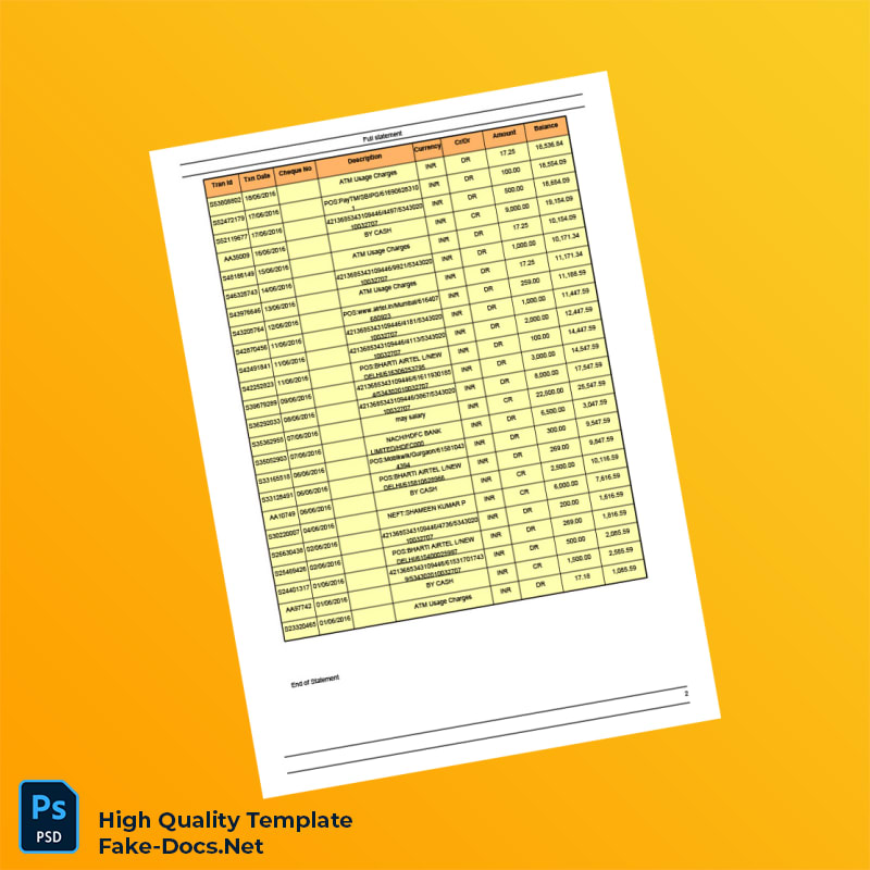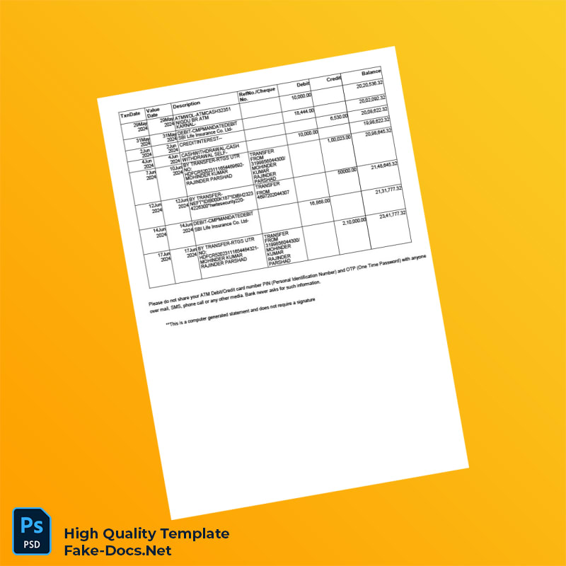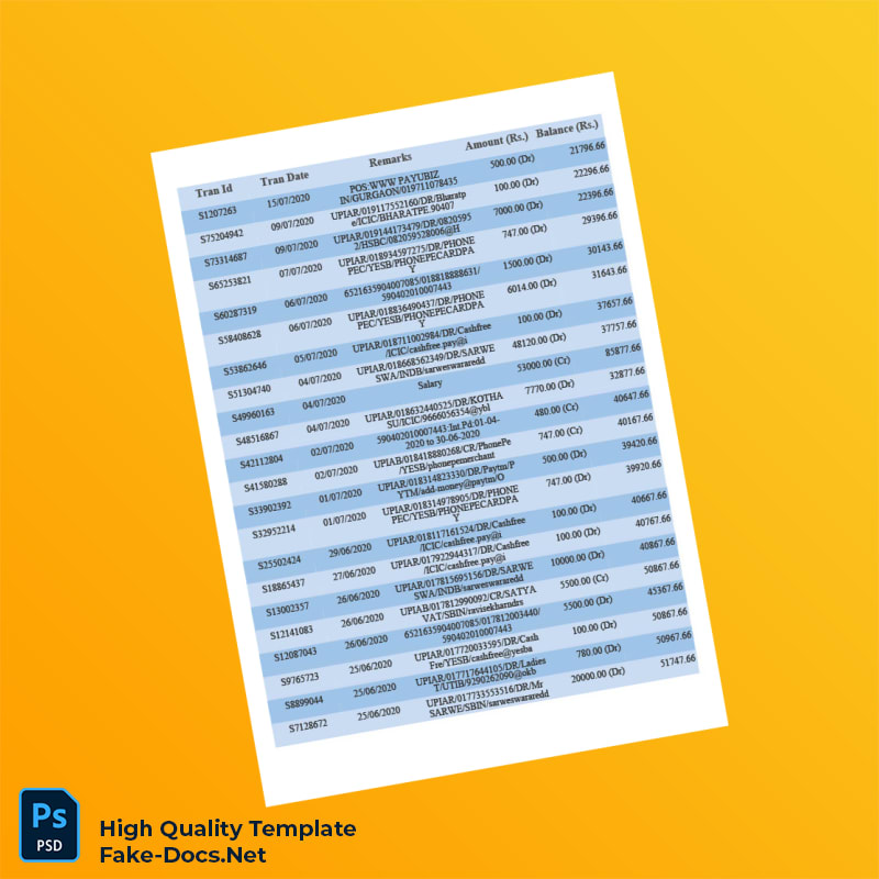 India Unknown Bank Statement Template in Word and PDF formats