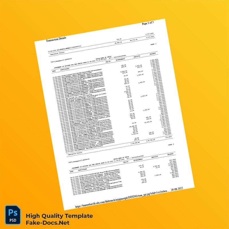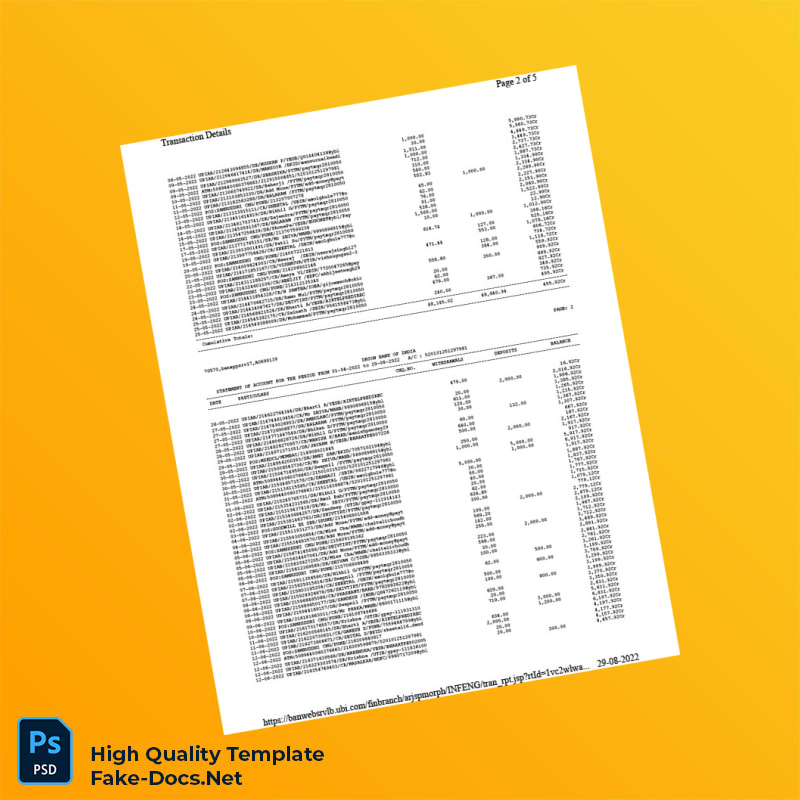 India Union Bank of India Bank Statement Template in Word and PDF formats 5 page