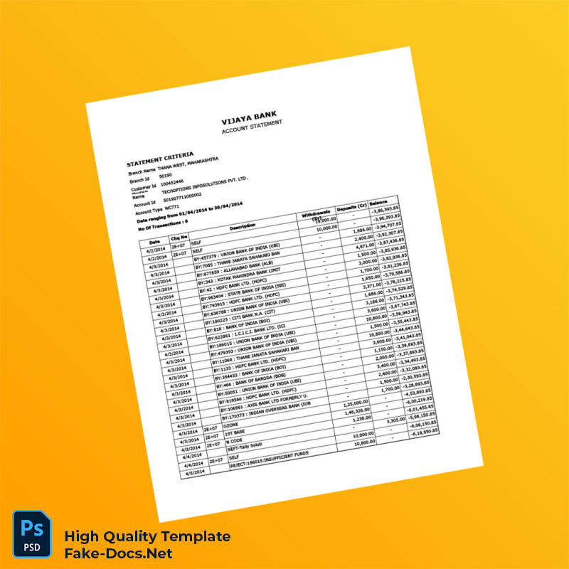 Easily manage your finances with our India Vijaya Bank Statement Template in Word and PDF formats—professional, customizable, and ready for your needs!