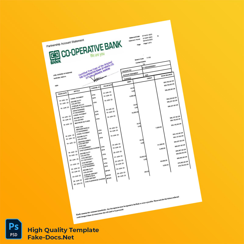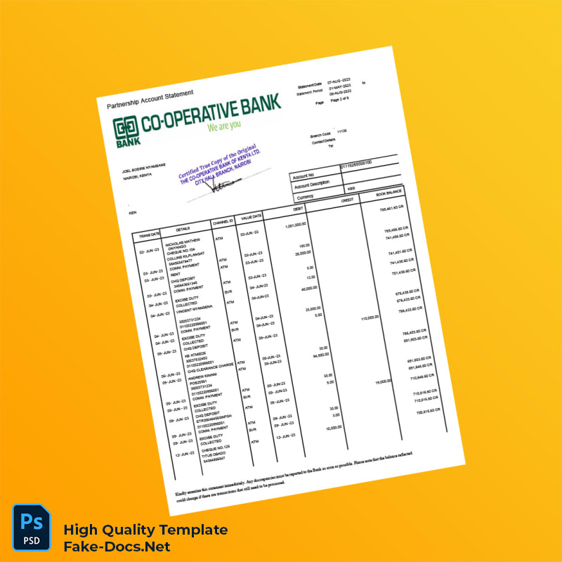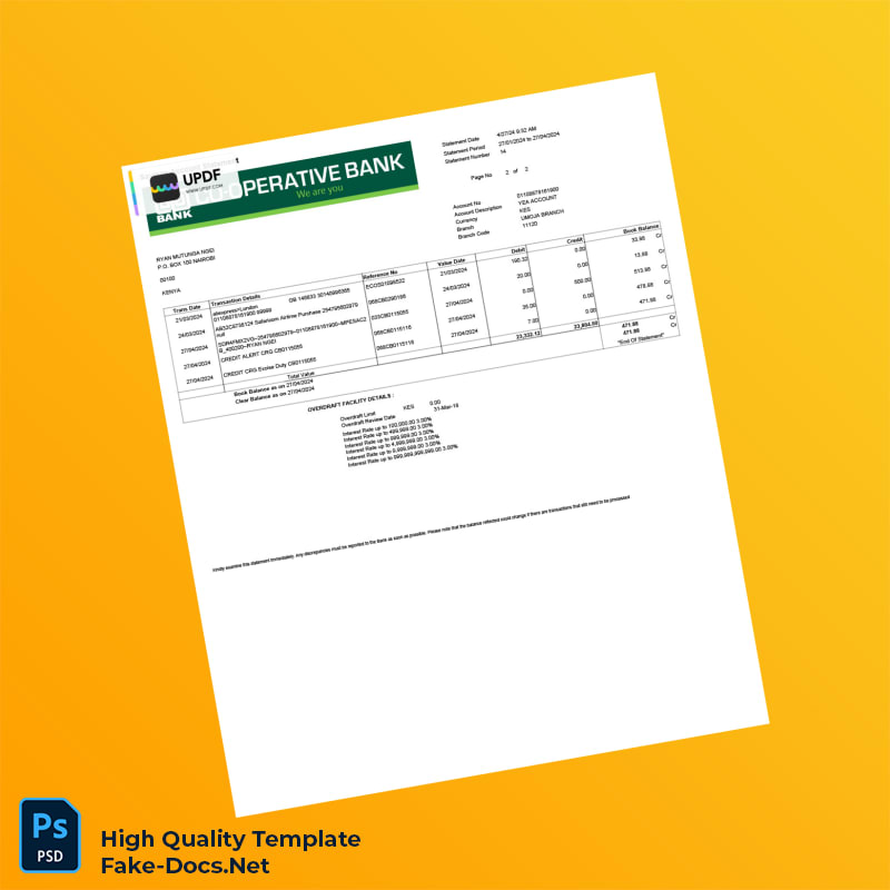 Kenya Co-operative Bank Statement Template in Word and PDF formats 8 page