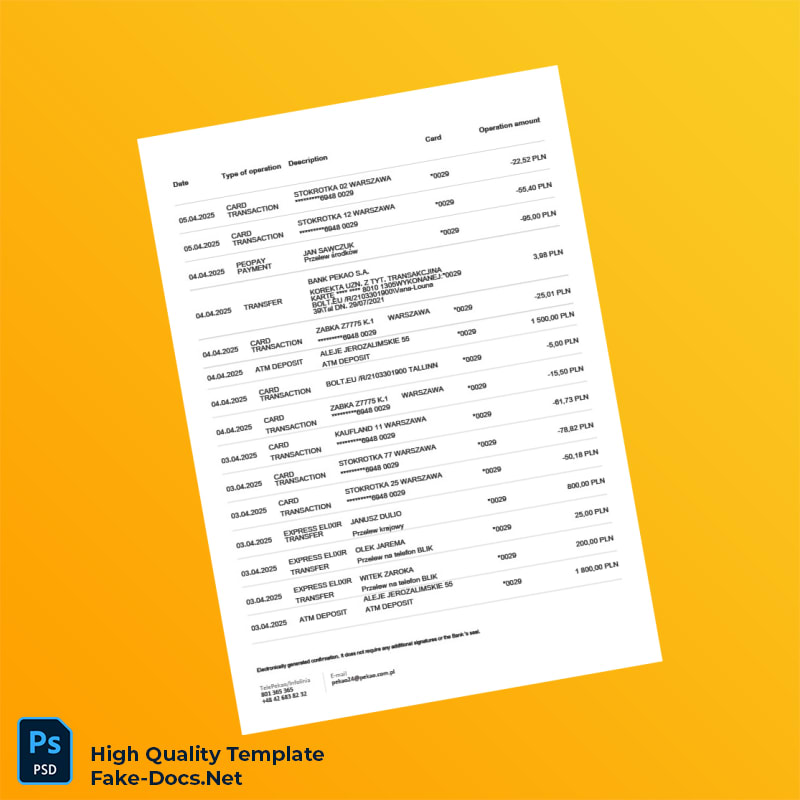 Poland Bank Pekao S.A bank statement template in .doc and .pdf format, fully editable