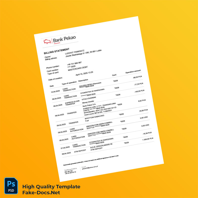 Poland Bank Pekao S A Billing Statement Template in Word and PDF formats