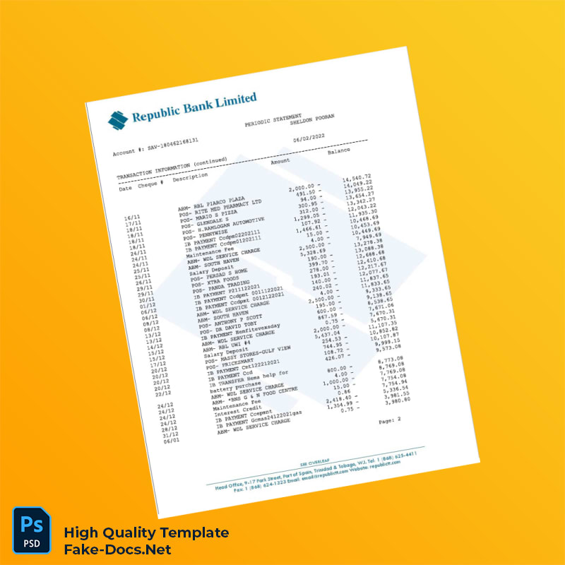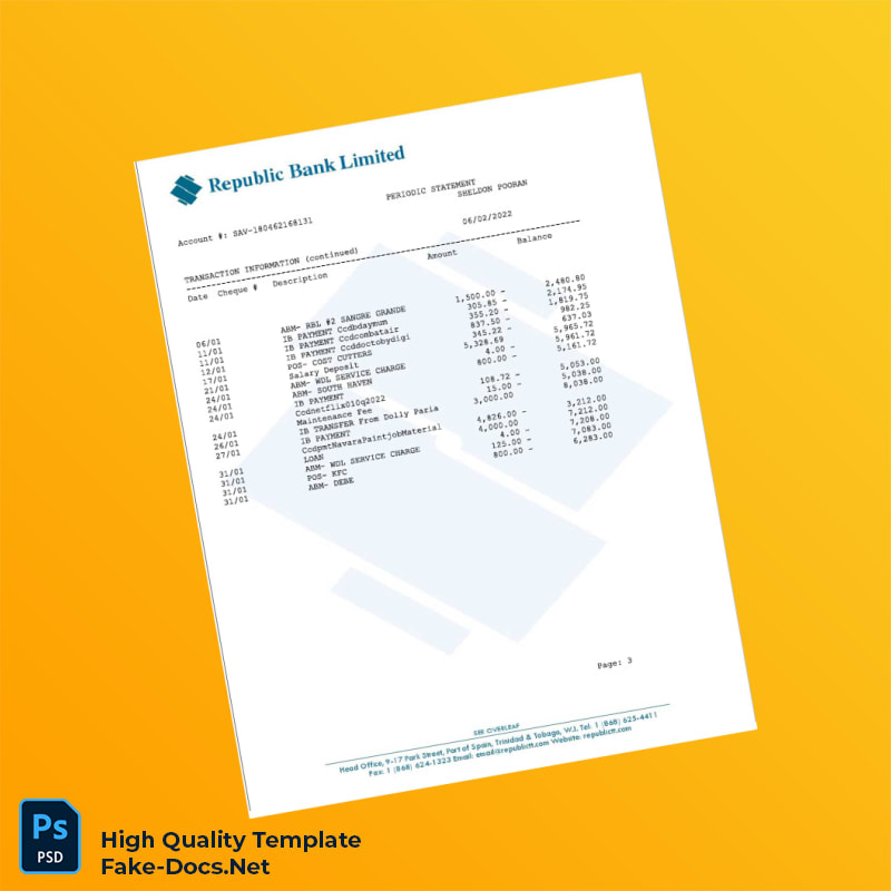 Trinidad and Tobago Republic Bank Bank Statement Template in Word and PDF formats 3 page