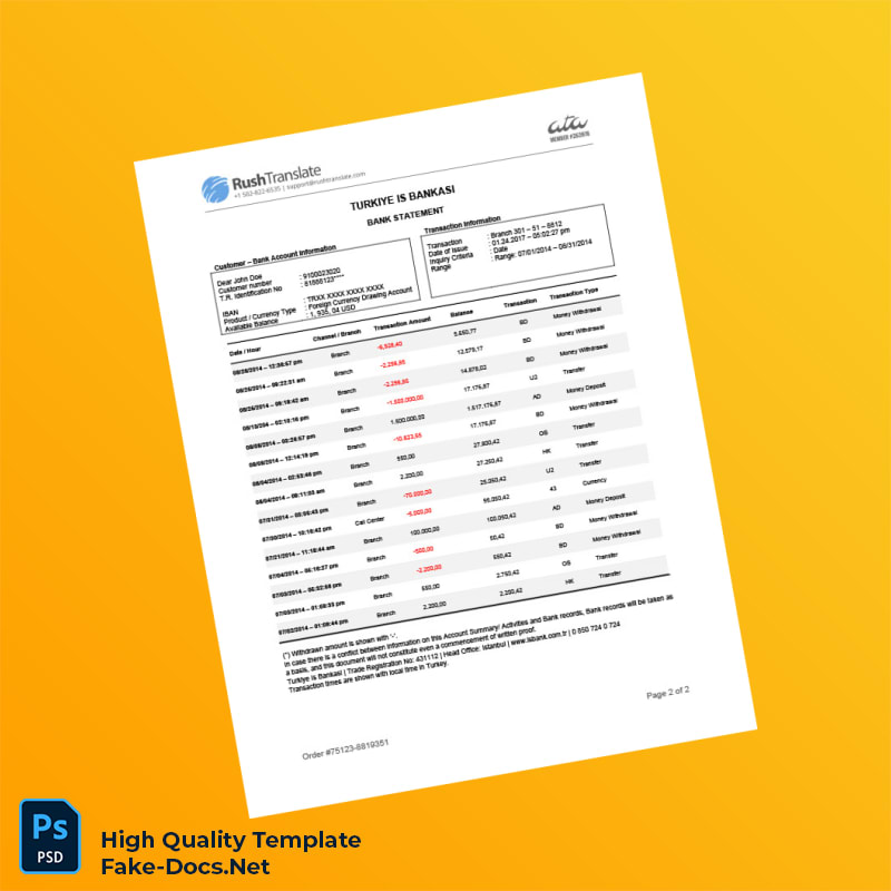Turkey Bankasi bank statement, Word and PDF template, 2 pages