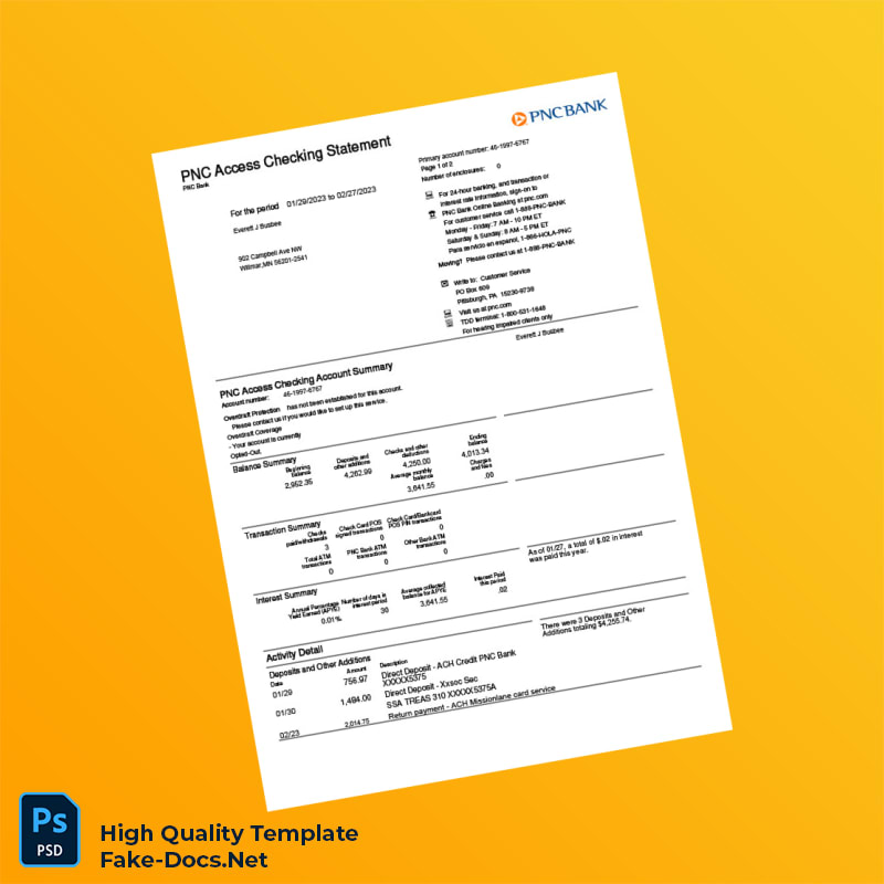 USA PNC Bank Statement Template in Word and PDF formats 2 page
