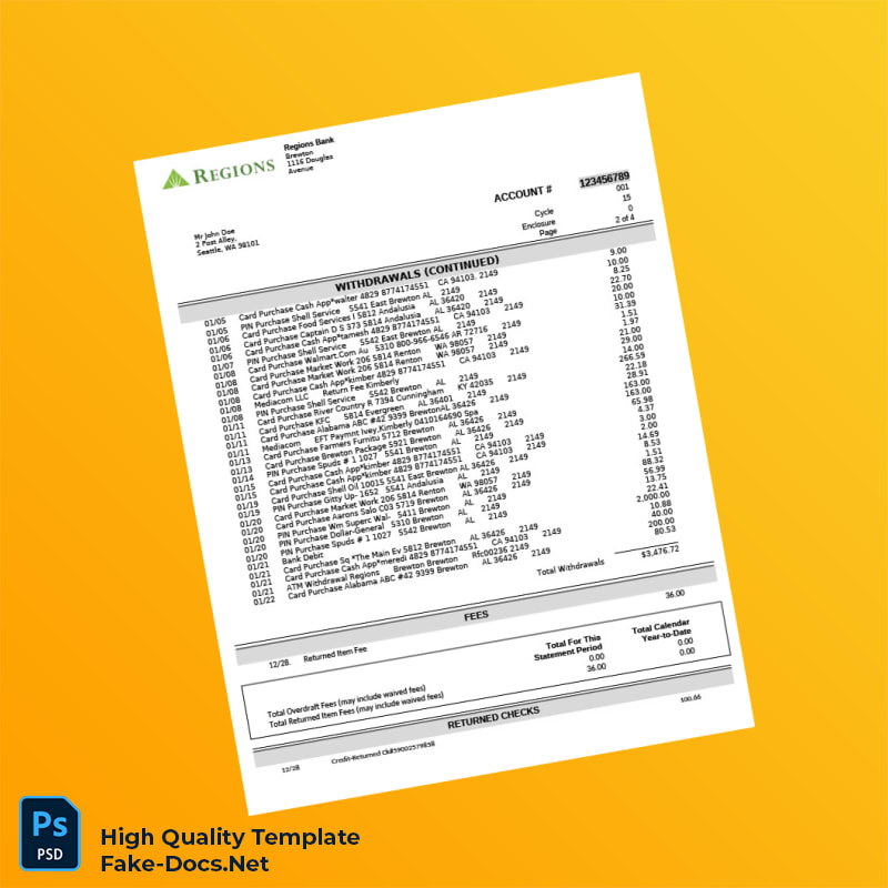 USA Regions Bank Personal Banking Statement Template in Word and PDF formats 4 page
