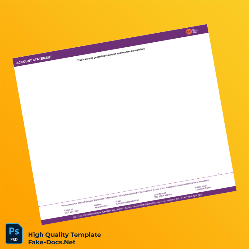 India AU Bank Statement Template in Word and PDF formats 2 page