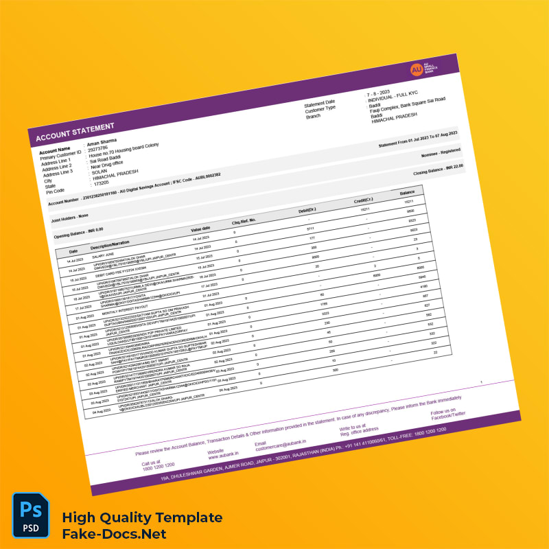 India AU Small Finance bank statement, Word and PDF template, 5 pages