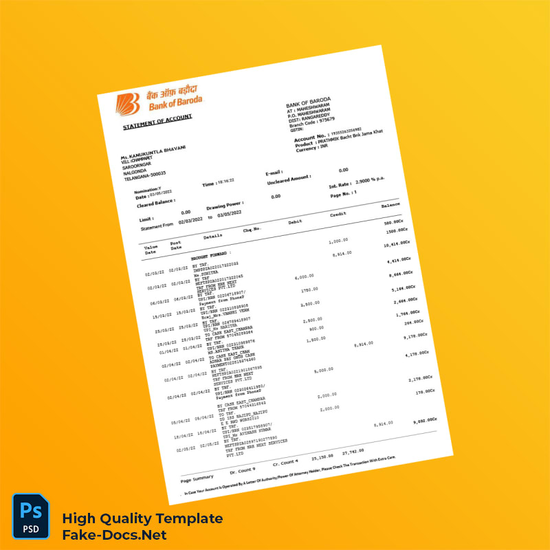 India Bank of Baroda Statement Template in Word and PDF formats 3 page