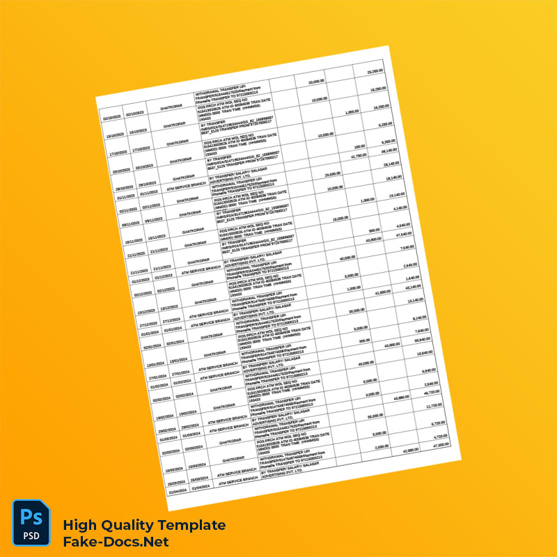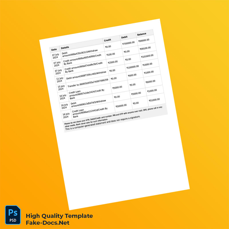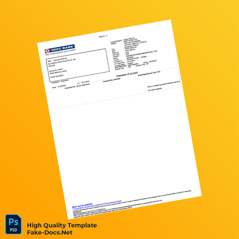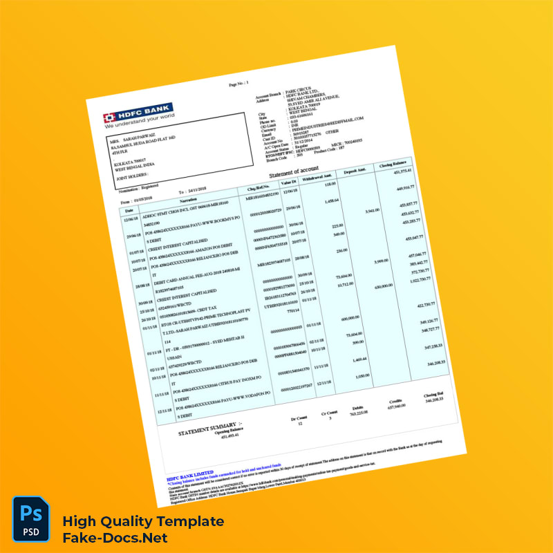India HDFC Bank Account Statement Template in Word and PDF formats 2 page