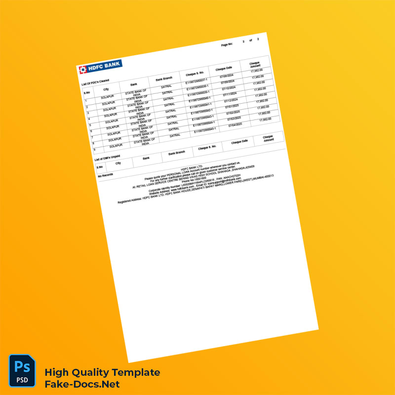 India HDFC Bank Loan Statement Template in Word and PDF formats 2 page