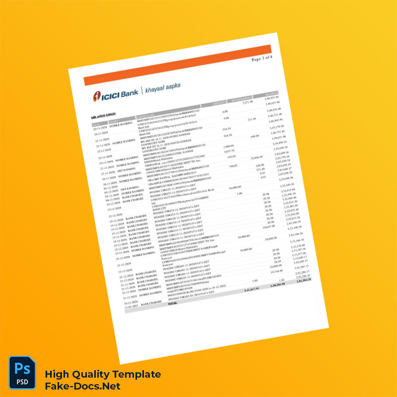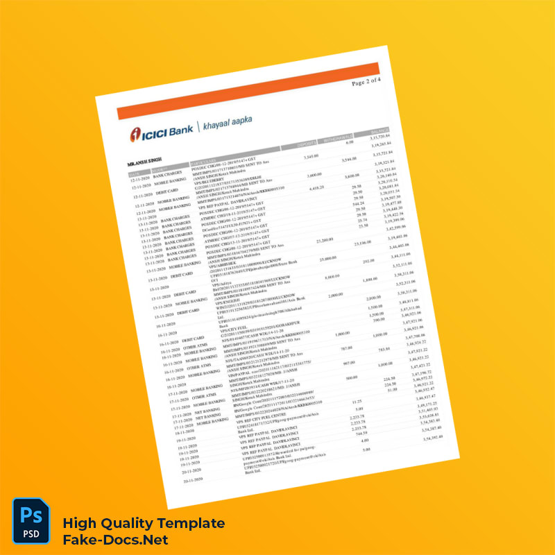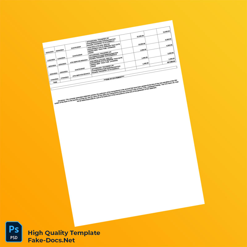 India ICI Bank Bank Statement Template in Word and PDF formats 4 page