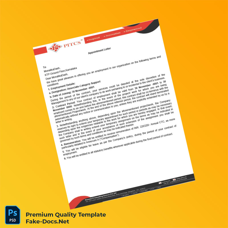 India PITCS Appointment Letter Template (Word & PDF) for fast, professional employment verification. Customize easily to streamline HR documentation.