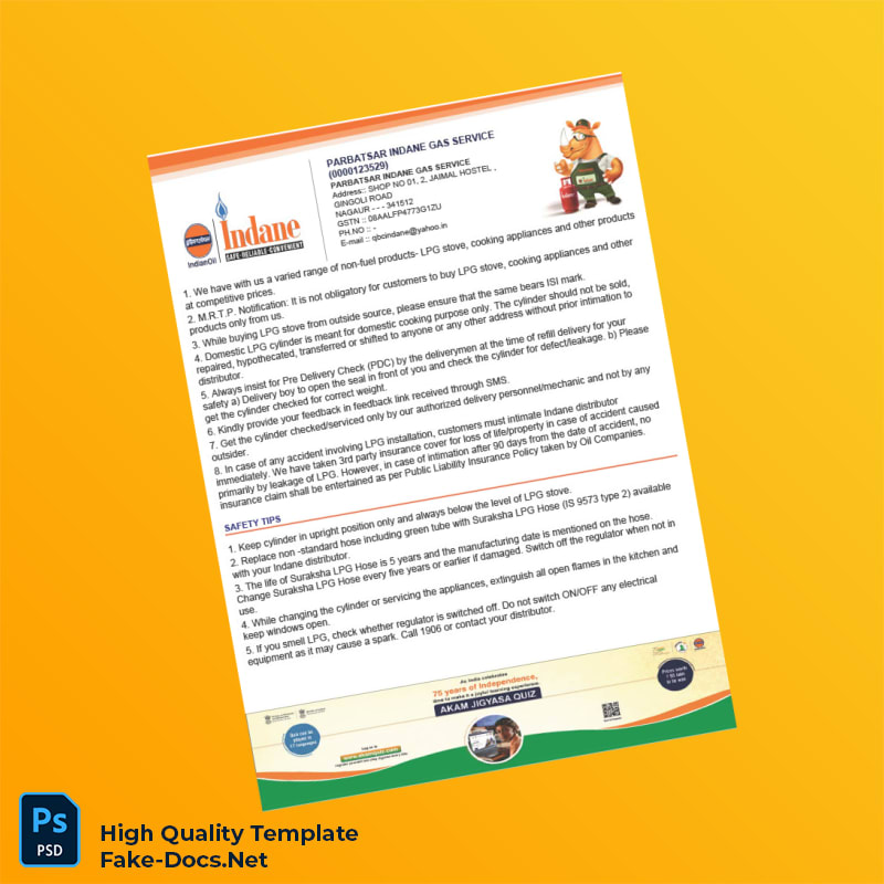 India Parbatsar Indane Gas Service Tax Invoice Template in Word and PDF formats 2 page