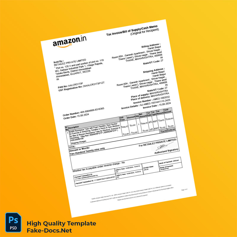 India RetailEZ Private Limited Invoice Template in Word and PDF formats India Amazon Seller Services Private Limited Tax Invoice 2 page