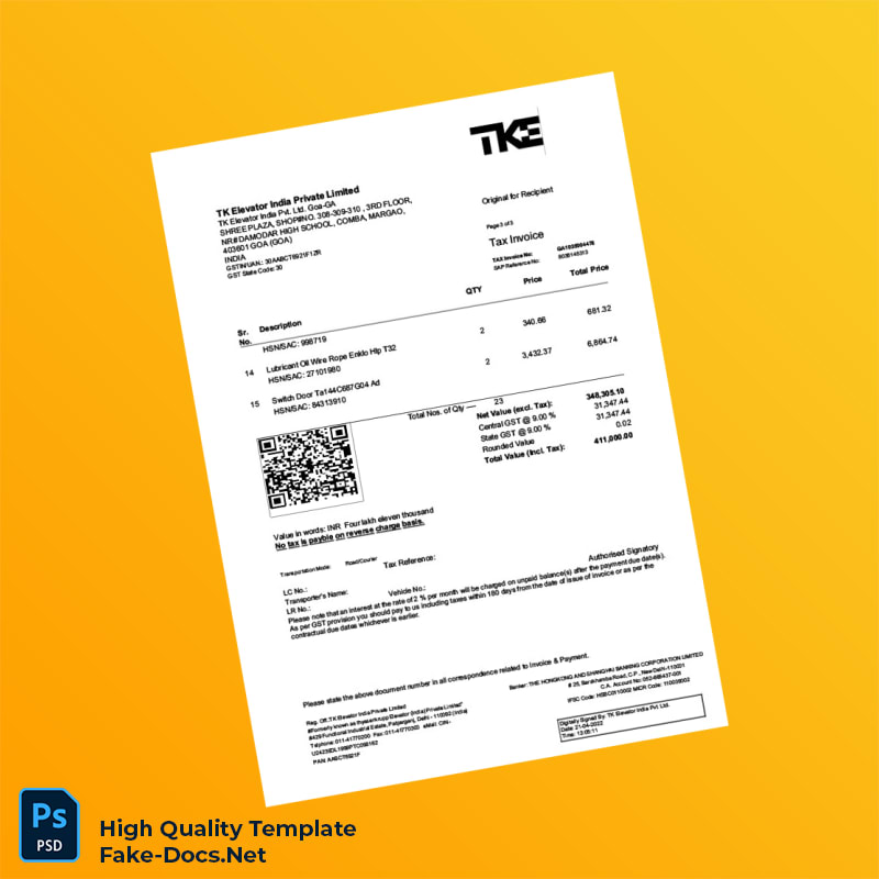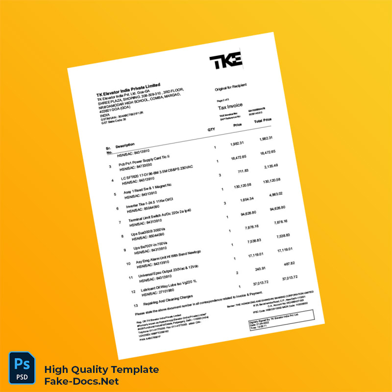 India TK Elevator India Private Limited Tax Invoice Template in Word and PDF formats 3 page