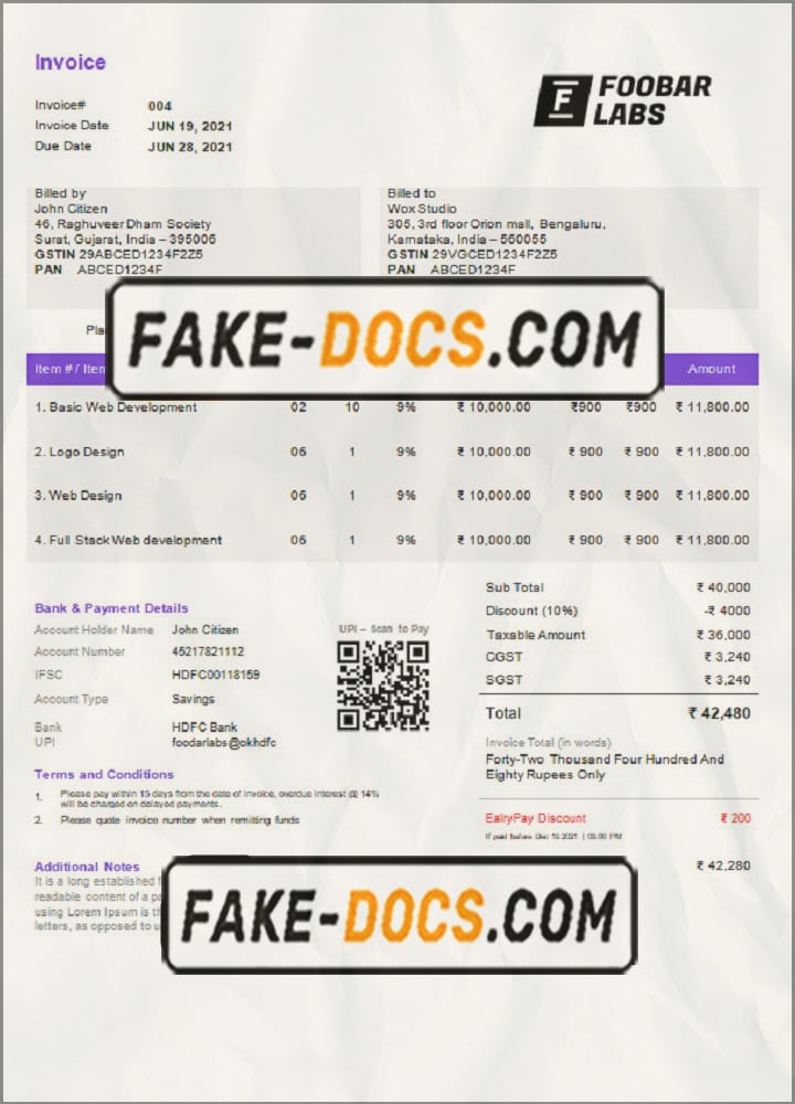India Foobar Labs Information Technology Company invoice template in Word and PDF format, fully editable, version 1