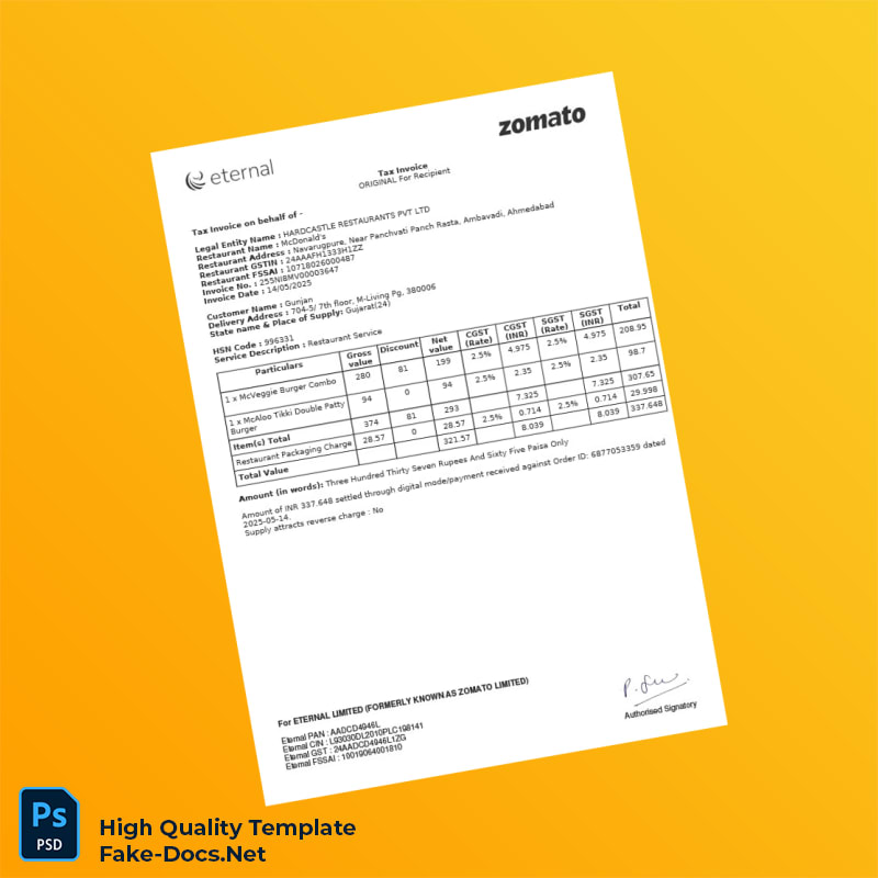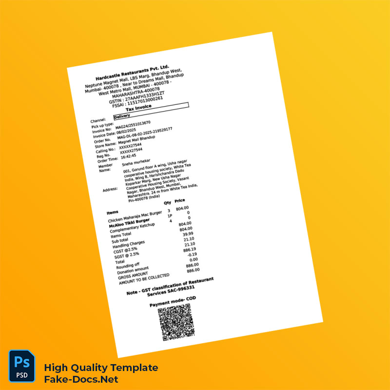 India Hardcastle Restaurants Pvt Ltd Tax Invoice Template in Word and PDF formats 2 page