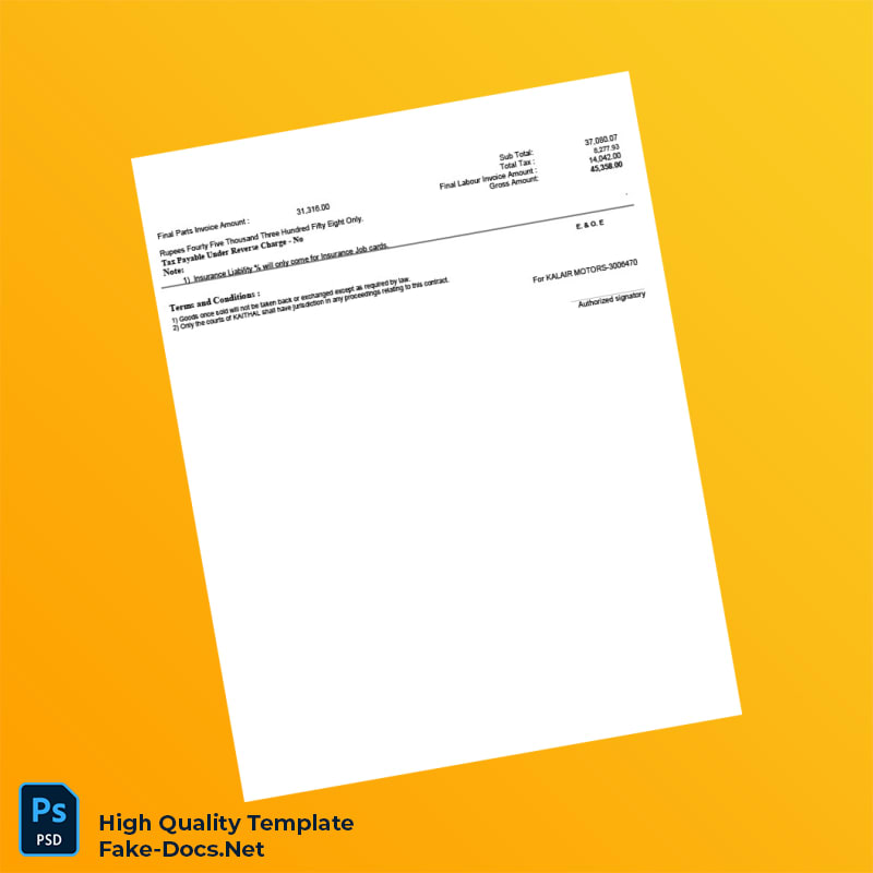 India Kalair Motors Tax Invoice Template in Word and PDF formats 2 page