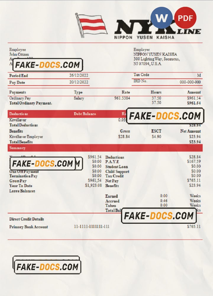 USA NIPPON YUSEN KAISHA shipping company pay stub Word and PDF template