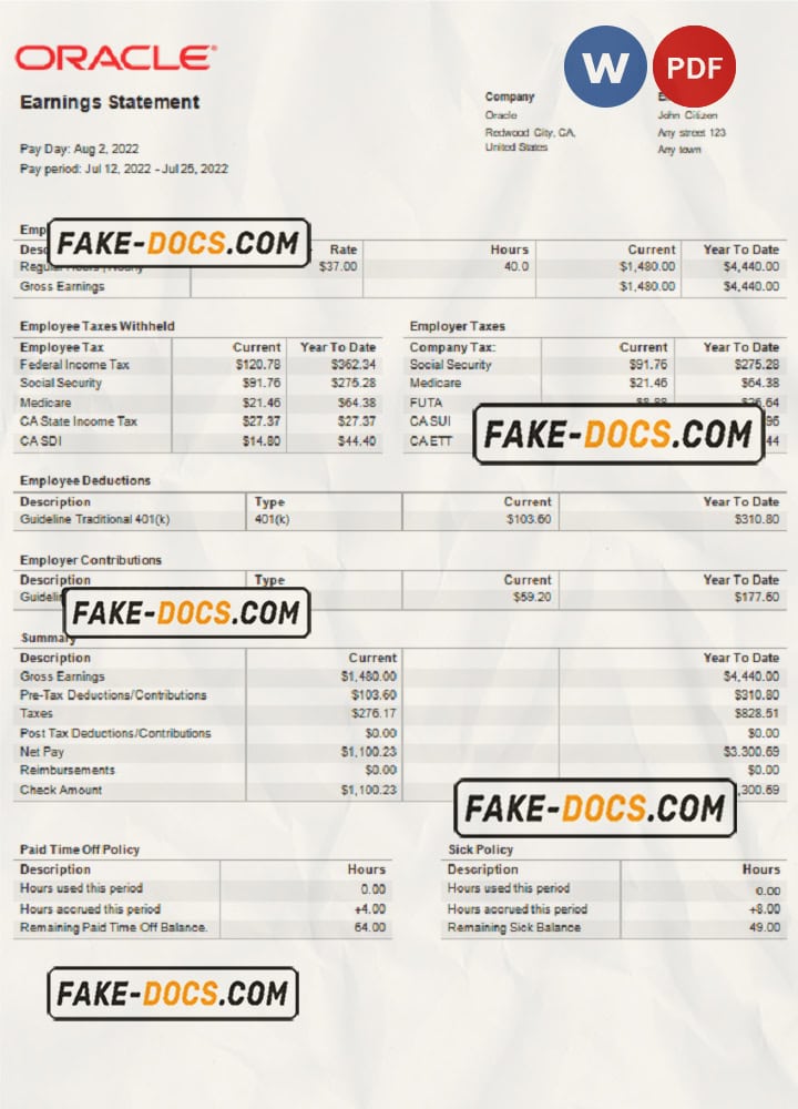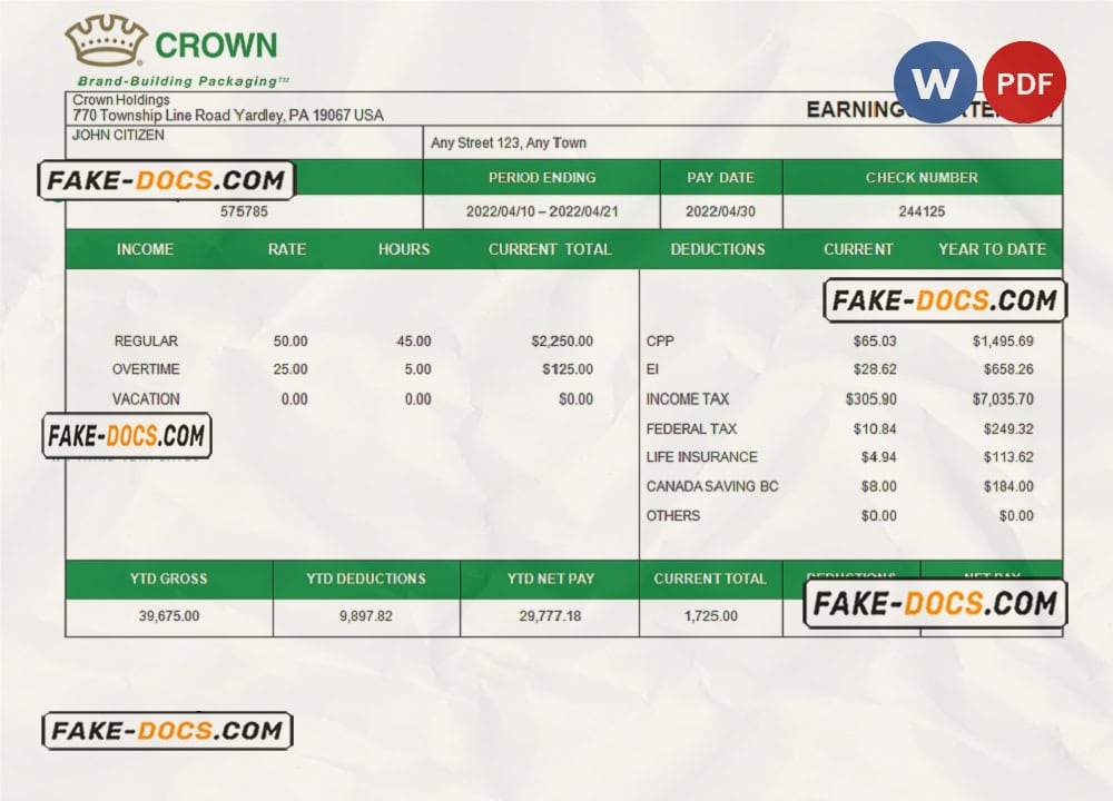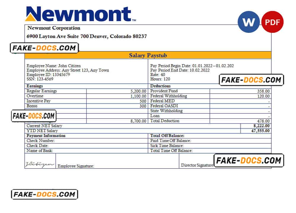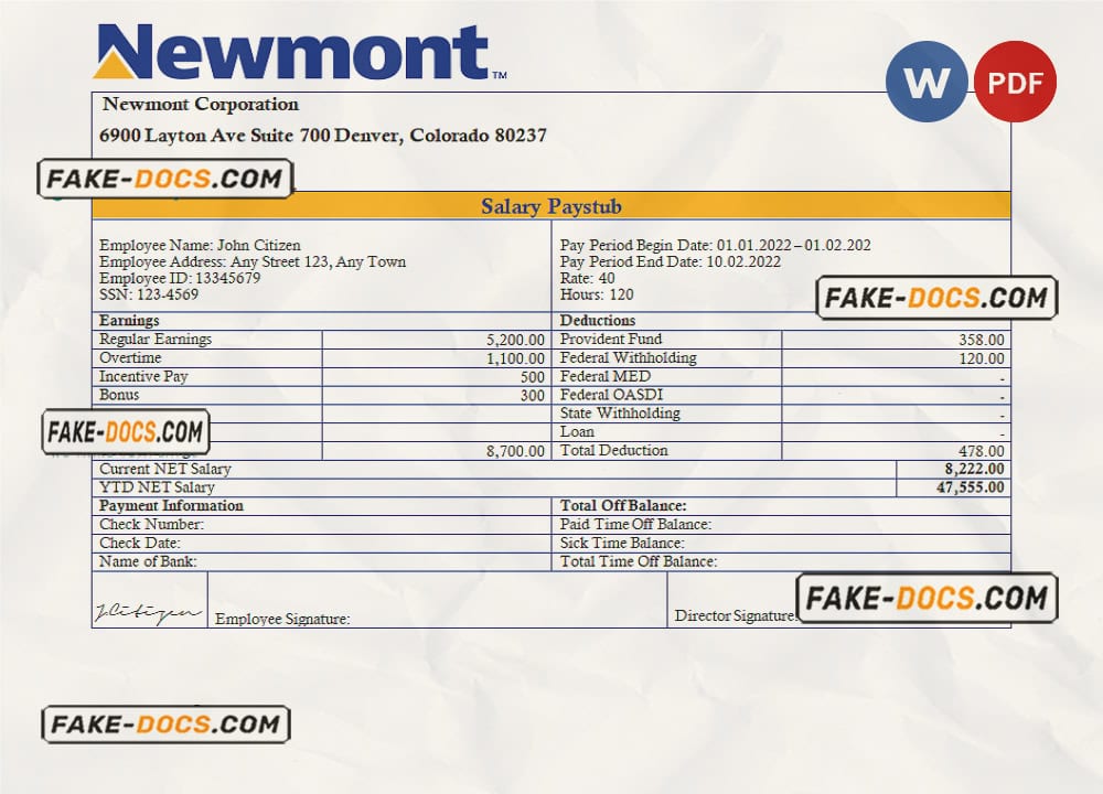 USA Newmont Corporation mining company pay stub Word and PDF template