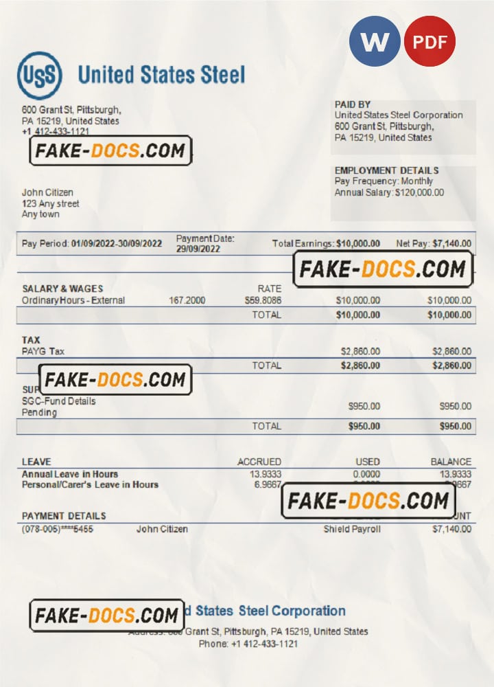 USA United States Steel Corporation steel production company pay stub Word and PDF template