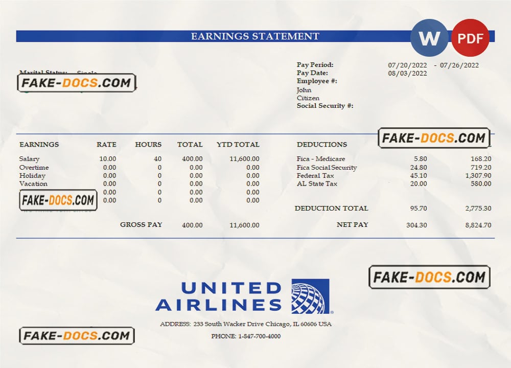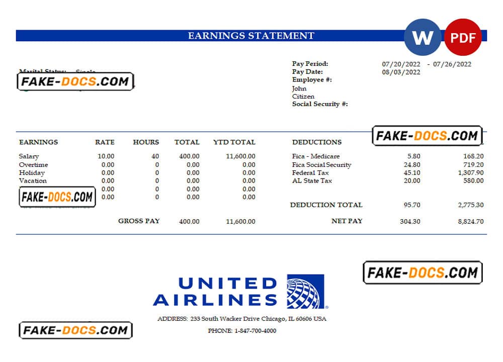 USA United Airlines Holdings airlines company pay stub Word and PDF template