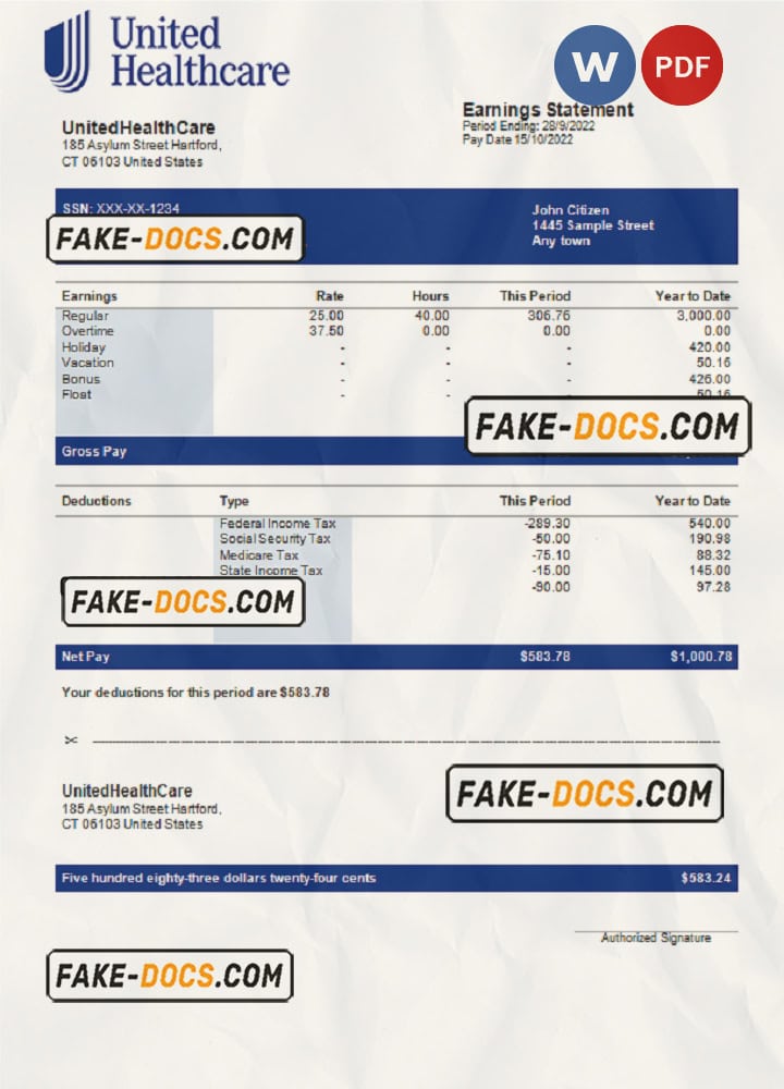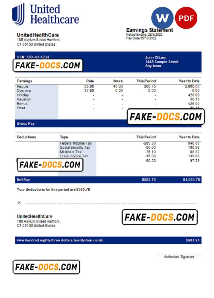 USA UnitedHealthCare managed care company pay stub Word and PDF template