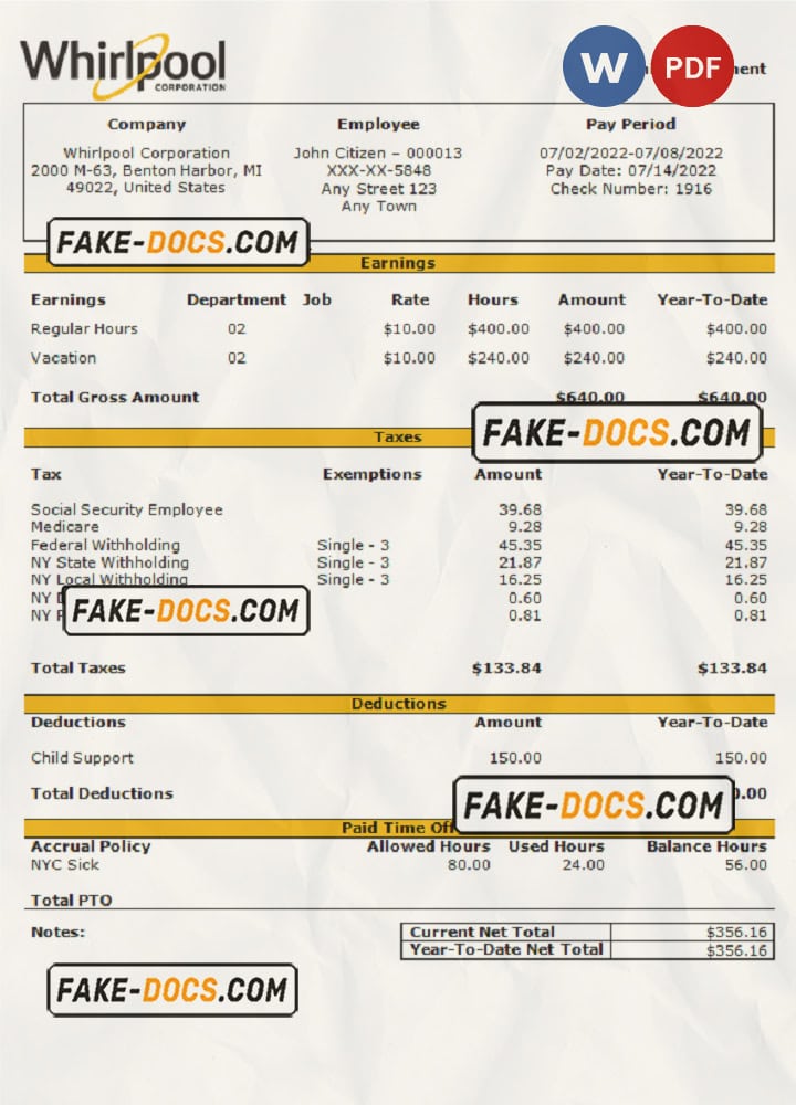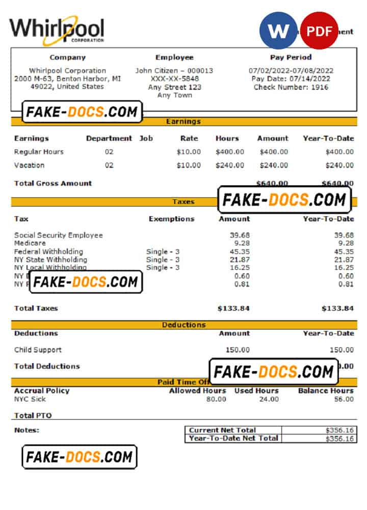 USA Whirlpool Corporation commercial company pay stub Word and PDF template