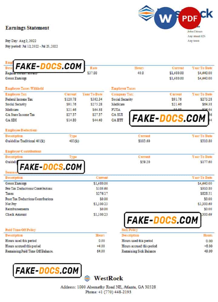 USA WestRock packaging company pay stub Word and PDF template