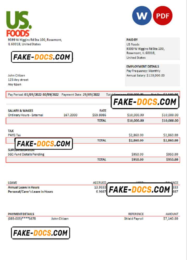 USA US Foods food distribution company pay stub Word and PDF template