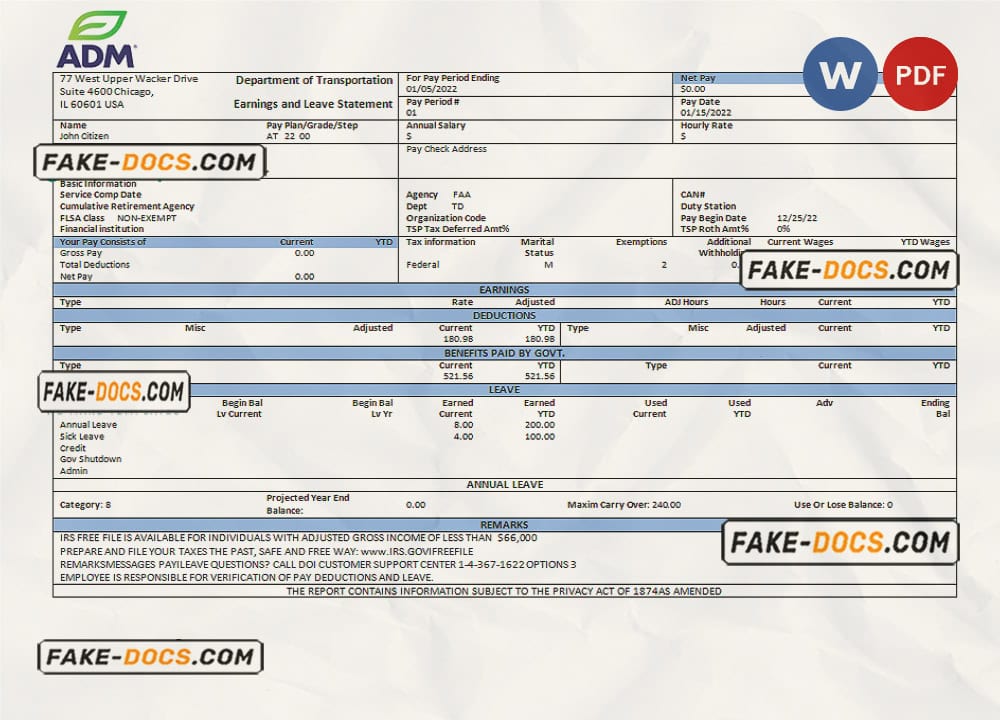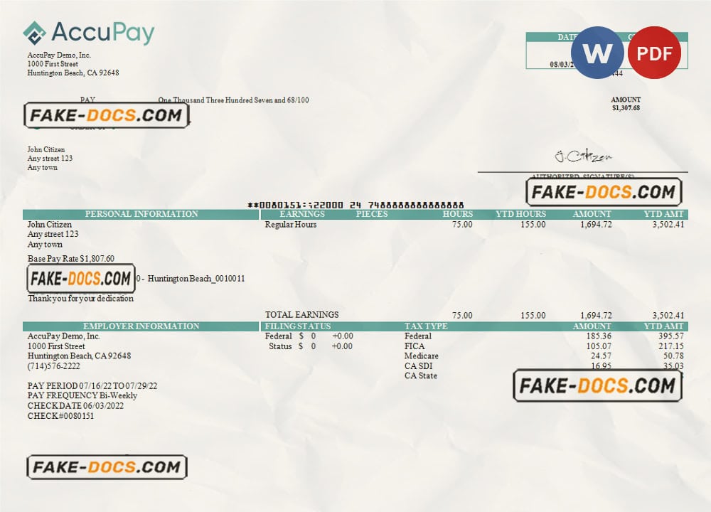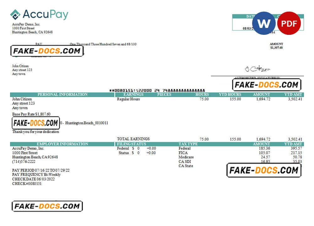 USA Accupay Demo Inc. payroll company pay stub Word and PDF template