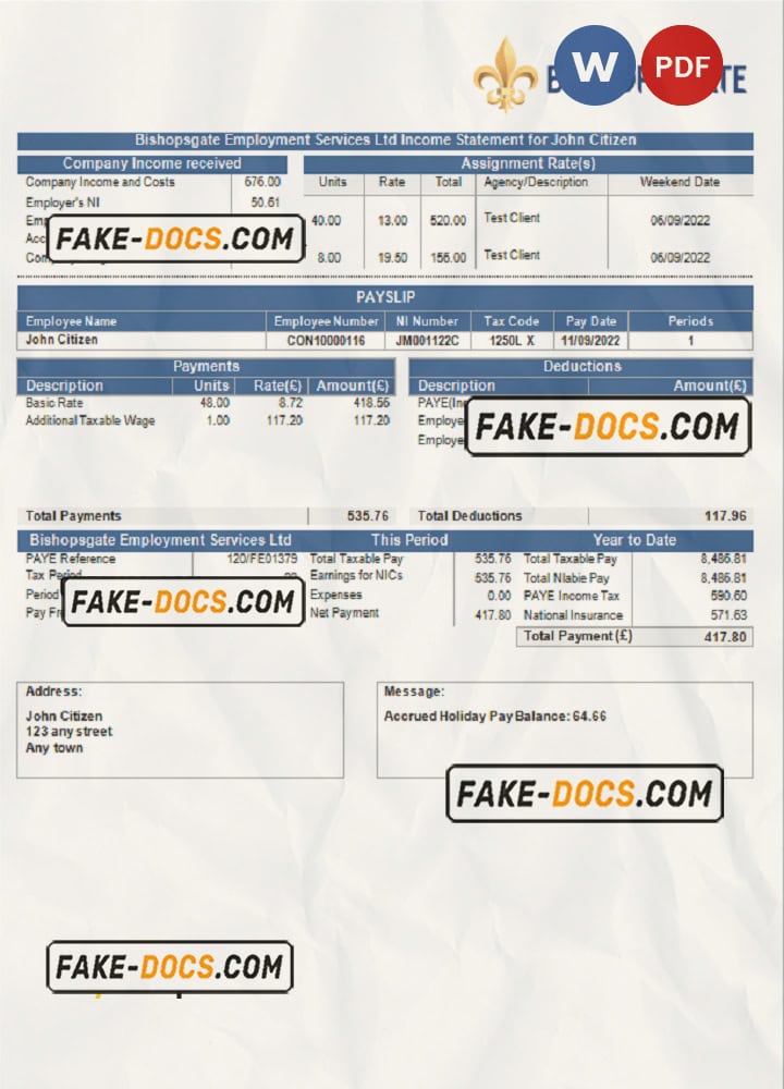 United Kingdom Bishopsgate payroll services company pay stub Word and PDF template