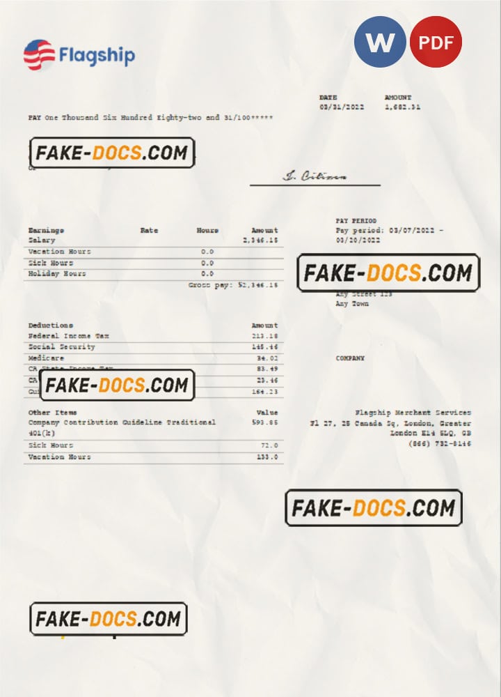 United Kingdom Flagship Merchant Services credit card service company pay stub Word and PDF template