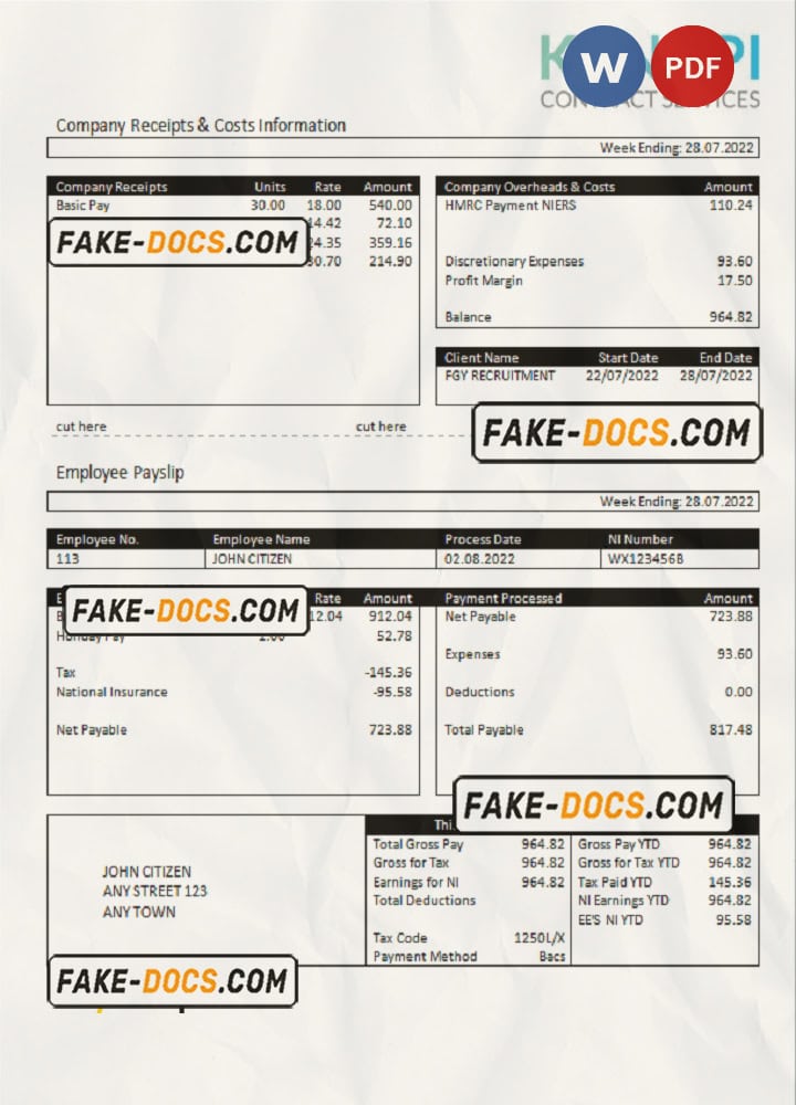 United Kingdom Kanopi Contract Services payroll company pay stub Word and PDF template