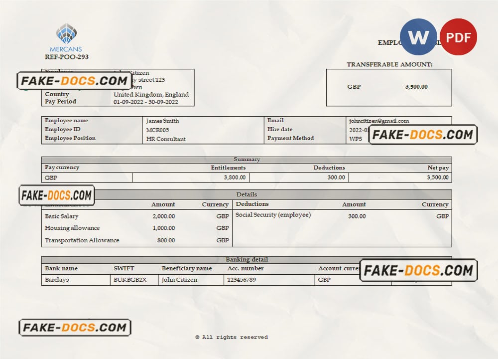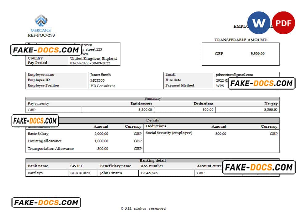 United Kingdom Mercans Global Payroll Solutions & Services payroll company pay stub Word and PDF template