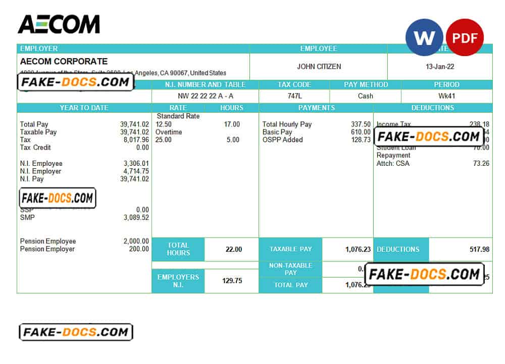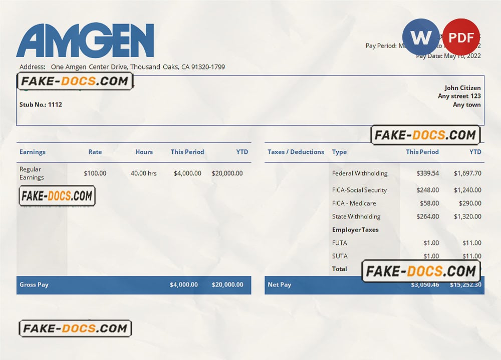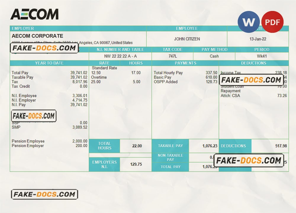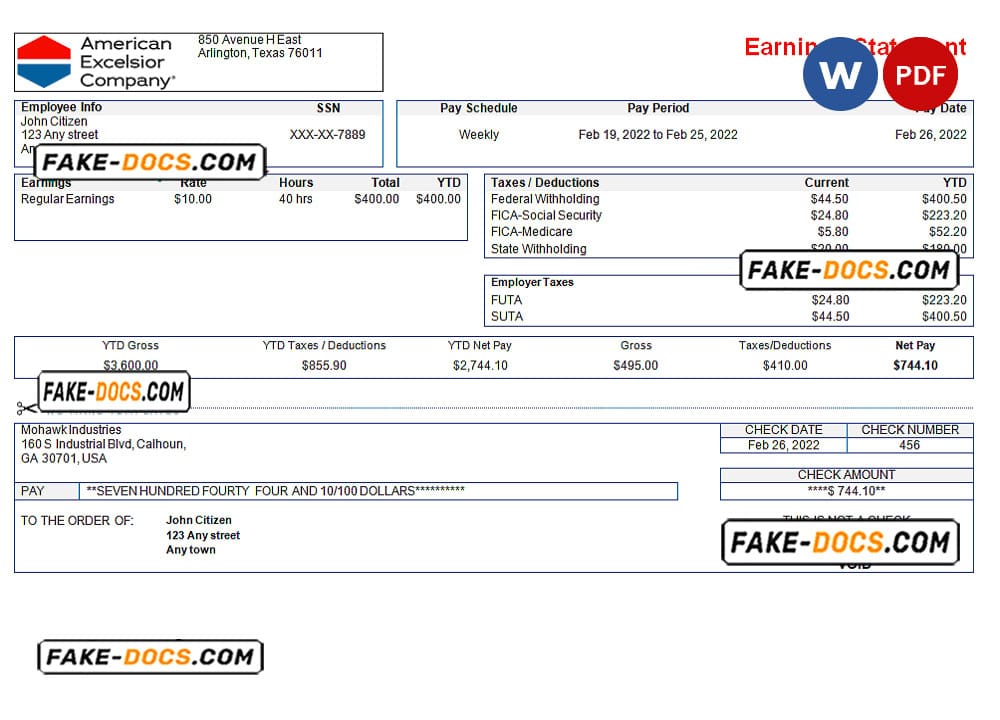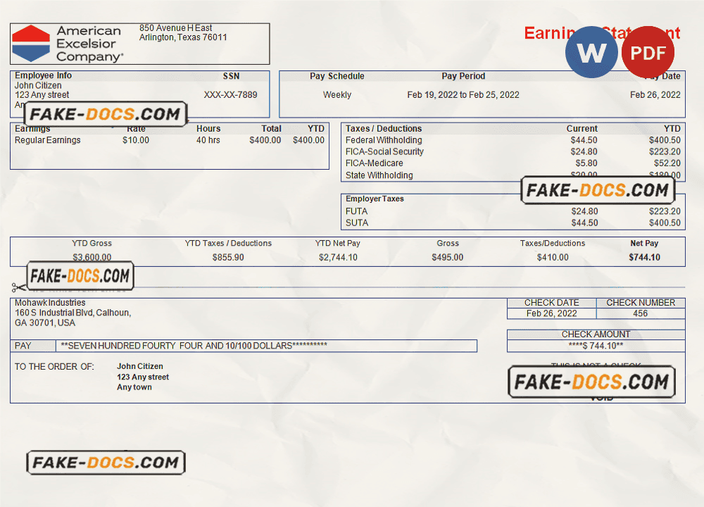 USA Aurora Specialty Textiles Group textile company pay stub Word and PDF template