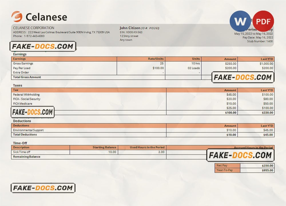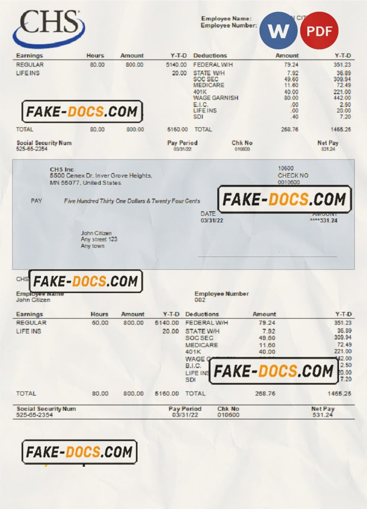 USA CHS Inc. agricultural company pay stub Word and PDF template