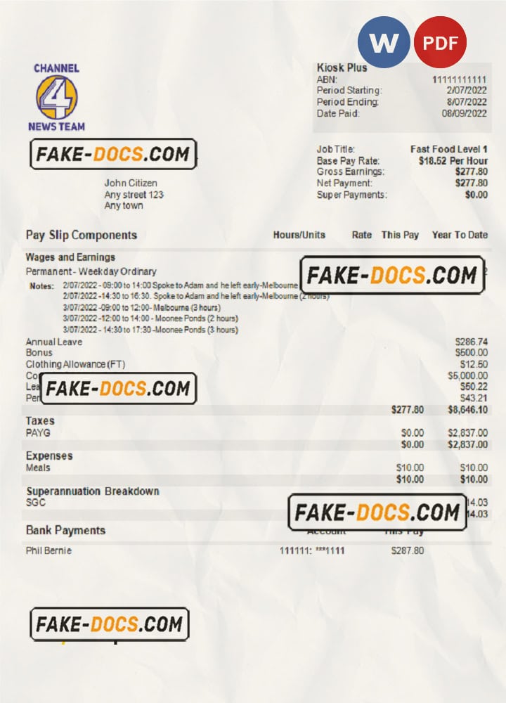 USA Channel News Team 4 media company pay stub Word and PDF template