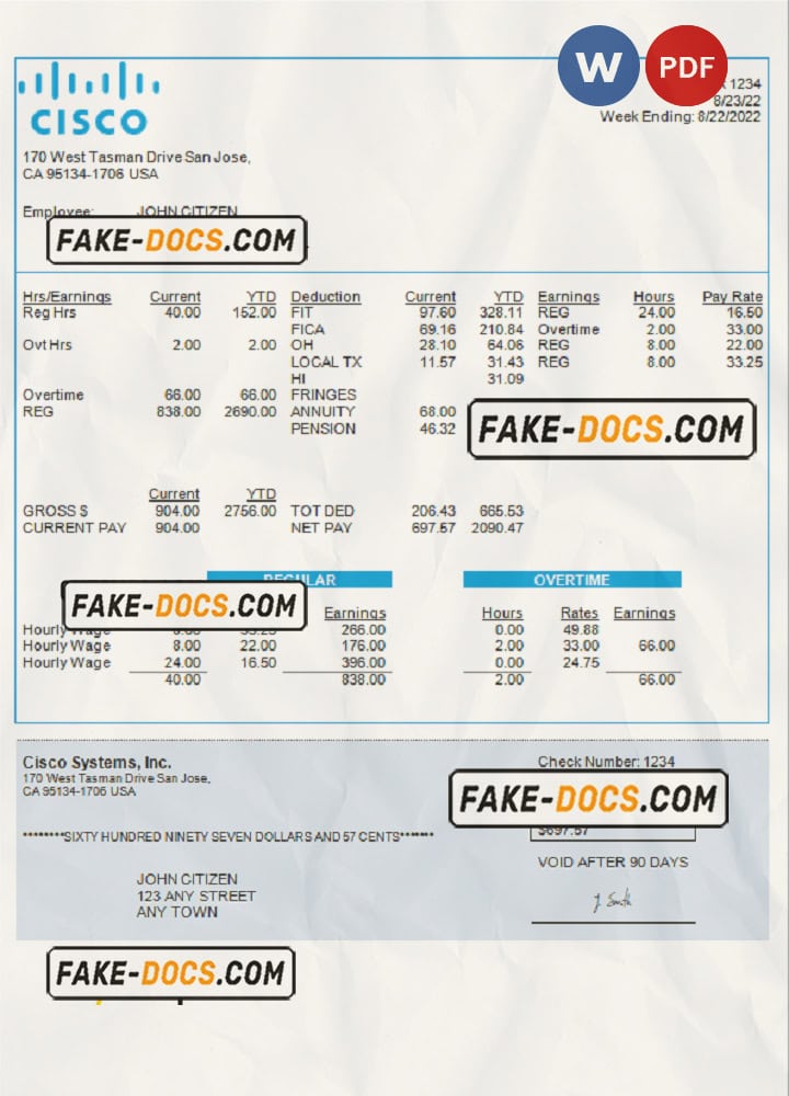 USA Cisco Systems, Inc. hardware company pay stub Word and PDF template
