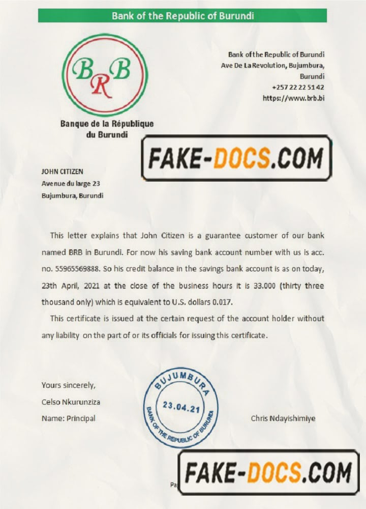 Burundi The Republic Bank of Burundi bank account reference letter template in Word and PDF format