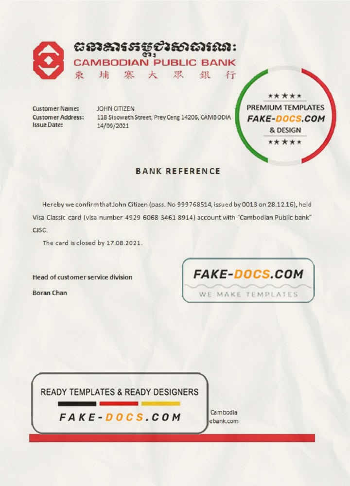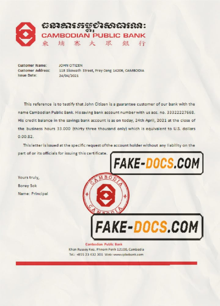 Cambodia Cambodian Public Bank account reference letter template in Word and PDF format