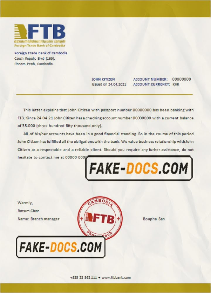 Cambodia Foreign Trade Bank of Cambodia bank account reference letter template in Word and PDF format