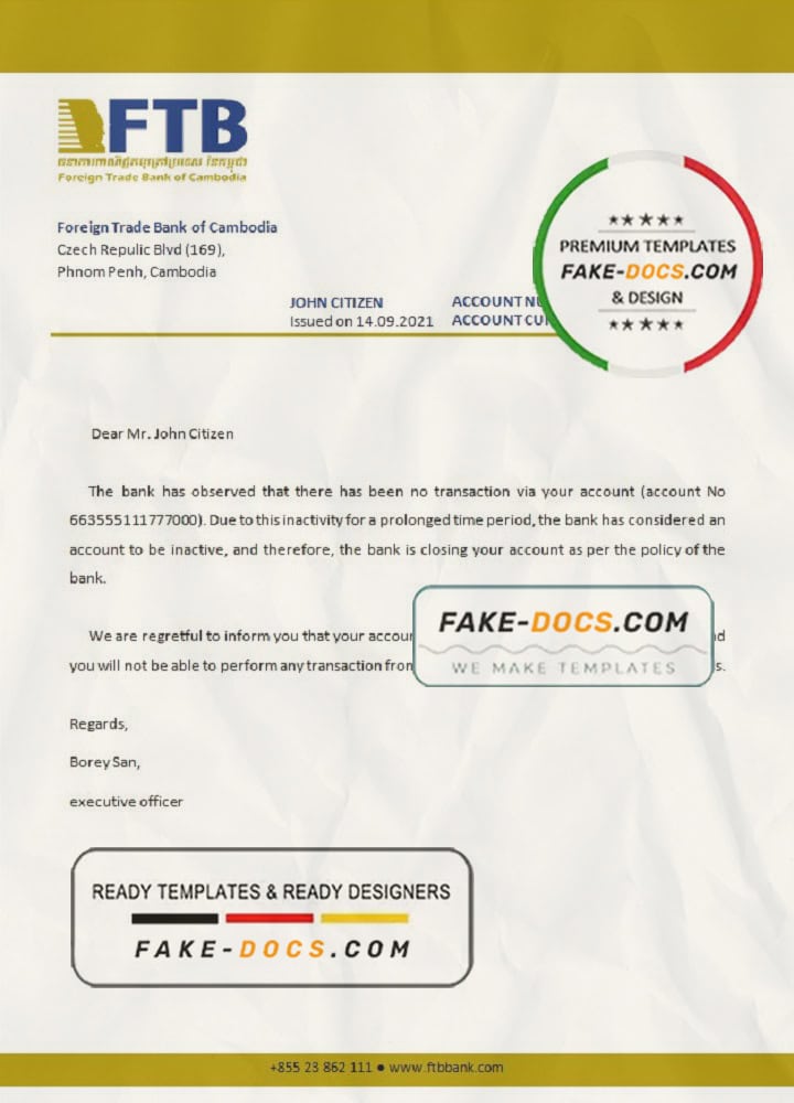 Cambodia Foreign Trade Bank of Cambodia bank account closure reference letter template in Word and PDF format
