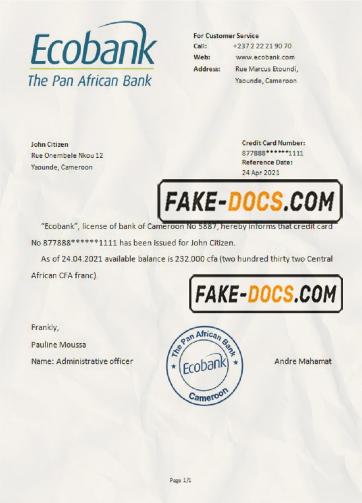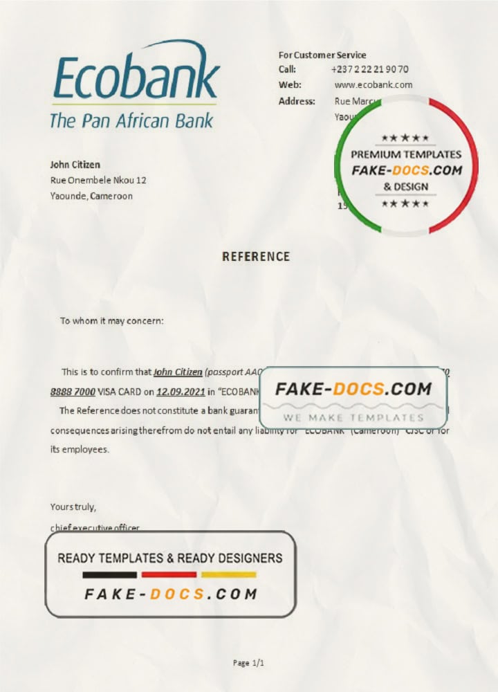 Cameroon Ecobank account reference letter template in Word and PDF format